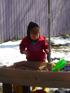 It's been warming up around here (thankfully!)... Conrad's back to playing outside and happy! He's now on not only a dairy free diet, but gluten free too. It's easier than you think, really. I bought a plain gluten free muffin mix and mixed in bananas and sprinkled them with unrefined brown sugar. Oh. MY. They are sooo good. He wanted one before I even got them in the oven! And when they were done he pulled out the sign for "eat". A first! :)